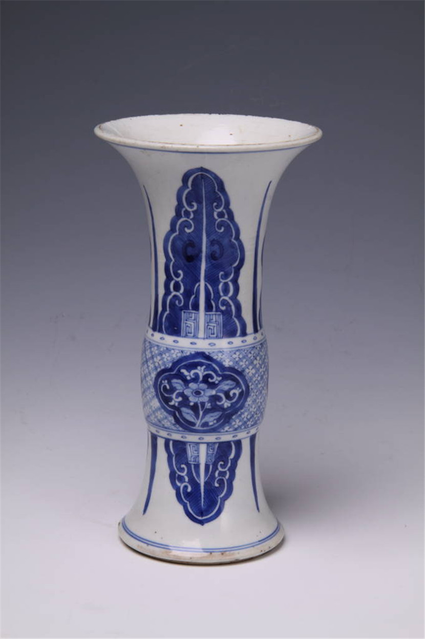 清康熙青花蕉叶纹瓶,撇口,器身呈花觚式,中腹处略鼓起,二层台圈足。口沿及近底处各绘双圈青花纹,腹部几何纹锦地,四如意头开光内绘兰地白花折枝花卉纹,上下绘青花蕉叶纹。白胎,胎骨坚致。釉面光滑细腻,青花鲜蓝青翠,明艳净丽,层次分明。足跟露胎。
