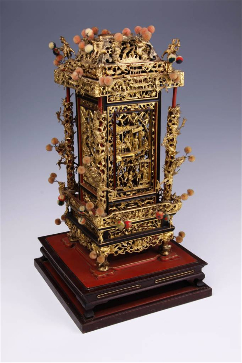 清硬木透雕漆金桌灯,木雕,可分为两部分,上为灯身,下为底座,灯身部分仿亭台结构。中空。顶部呈三层塔状,最上层呈覆斗状,中一孔为烟孔,下二层逐步外扩,方形,三层四周全部透雕漆金花板,上层为海水、龙等,中为飞禽,屋宇四角各有一骑兽人物,以铁丝与主体连接,下为双龙屋宇。灯身中部四角各有一柱,柱身套透雕蟠龙,中间四面嵌透雕漆金人物故事及花鸟图案活动板,四周美人靠栏沿,栏沿透雕漆金人物花鸟图案?;喜闳粜朊痔?,束腰嵌四片透雕漆金花鸟、瓜果等图案,四角各有一力士,下层四角各安一兽形脚,间饰透雕漆金花卉图案牙板。灯身并饰有彩色绒球。底座部分呈三层,自上而下逐级外延,最上一层为条状花板,四角雕如意头,承接灯身,中为几案形,束腰部分每面各有二长条形镂孔,下为盘状平台,隼卯结构。雕工精美,工艺精湛。整器以金色漆为主,辅以红、黑、褐色漆。