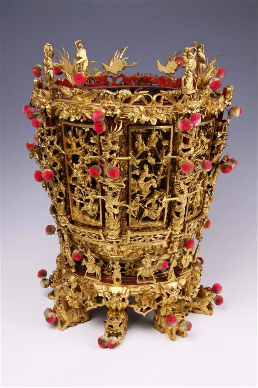 清硬木透雕漆金菓盒,木雕,分上下两部分,上为菓盒身,下为底座,菓盒呈筒形,中空,顶部透雕一周缠枝瓜果,上嵌立八只凤凰。菓盒腹部嵌八块透雕人物故事花板,花板背衬镂空漆金万字纹,花板内外双层四周浮雕缠枝花卉,上下雕一周回纹,上部回纹上嵌八只龙首,龙首上嵌人物立像,龙首间嵌一朵花卉,下部回纹上嵌八只莲花形柱础,下由一跪姿力士托住,柱础间嵌八块透雕花卉护栏,龙首与柱础间套透雕鲤鱼跳龙门及盘龙柱。肚眉为八个如意形开光,内浮雕花果图案,束腰处嵌八块透雕花鸟图案。束腰外围底座上穿插嵌八个人物立像和八个人物骑马像。底座八狮首间雕花卉,八只小卧狮托住狮首足,菓盒上并饰彩色绒球,雕工精美,工艺精湛。通体漆金,间有红、黑漆。