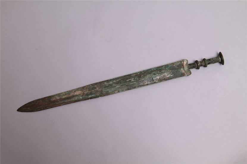 战国双箍青铜剑,青铜铸造,素格素首,柳叶形剑身,刃非常锋利,脊凸起,柄中间有双箍,剑首呈漏斗形,器身较沉。