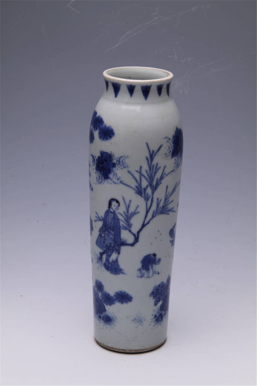 清康熙青花人物纹统瓶,侈口,粗短颈,溜肩,筒腹,平底内凹。口沿下绘蕉叶纹一周,肩部暗刻一周缠枝花卉纹,腹部绘青花山水人物图案,近底部暗刻一周几何纹。白胎,胎质细密。釉面光滑细腻,青花鲜蓝青翠,明艳净丽,层次分明。底部露胎。