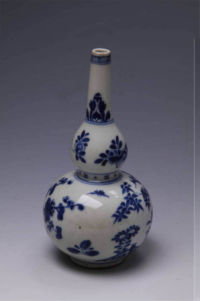 清康熙青花花卉纹葫芦瓶,直口,细长颈,束腰,葫芦形,圈足。口沿处绘左右相间的斜条纹,颈部饰青花花卉纹,上腹绘青花花卉纹,束腰处为青花十字、圆点纹,下腹为梅、兰、竹、菊花纹,色泽鲜艳,层次分明。白胎,胎质坚致。釉面光滑细腻,青花鲜蓝青翠,明艳净丽,层次分明。足跟露胎。
