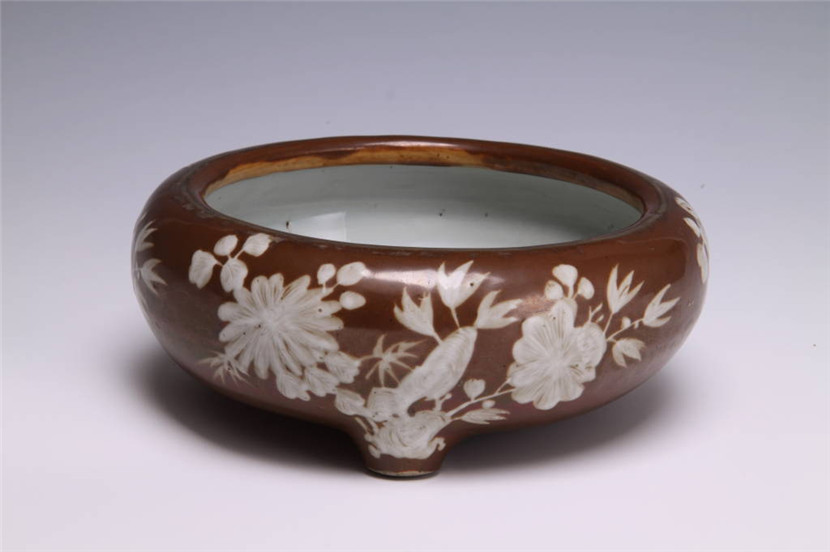 明酱釉白花花卉纹三足炉,敛口、钵体、三足。外腹部及足饰白色菊花、竹等纹饰。白胎,胎骨坚致,较厚重。炉内施白釉,釉色泛青,内底有芝麻点,炉外施酱釉,釉质肥厚,足底有明显的火焰纹,足跟露胎。